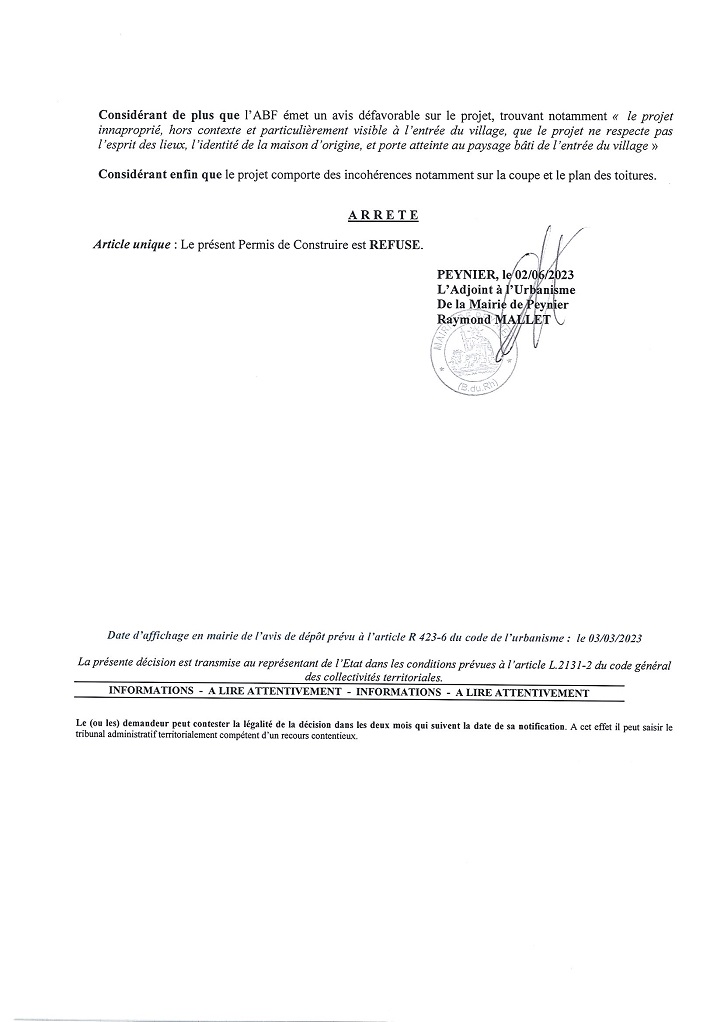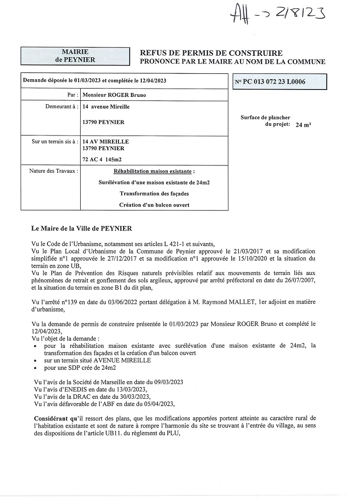 Refus de permis de construire prononcé par le Maire au nom de la Commune.