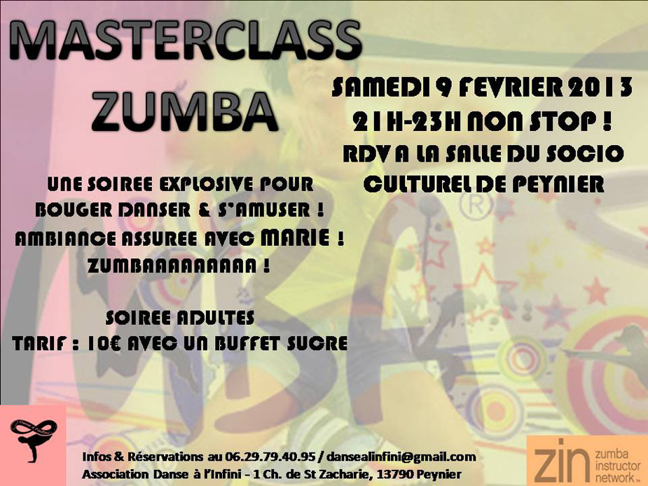 Danse à l’infini propose une soirée explosive de Zumba le samedi 9 février 2013 pour bouger, danser et s’amuser.