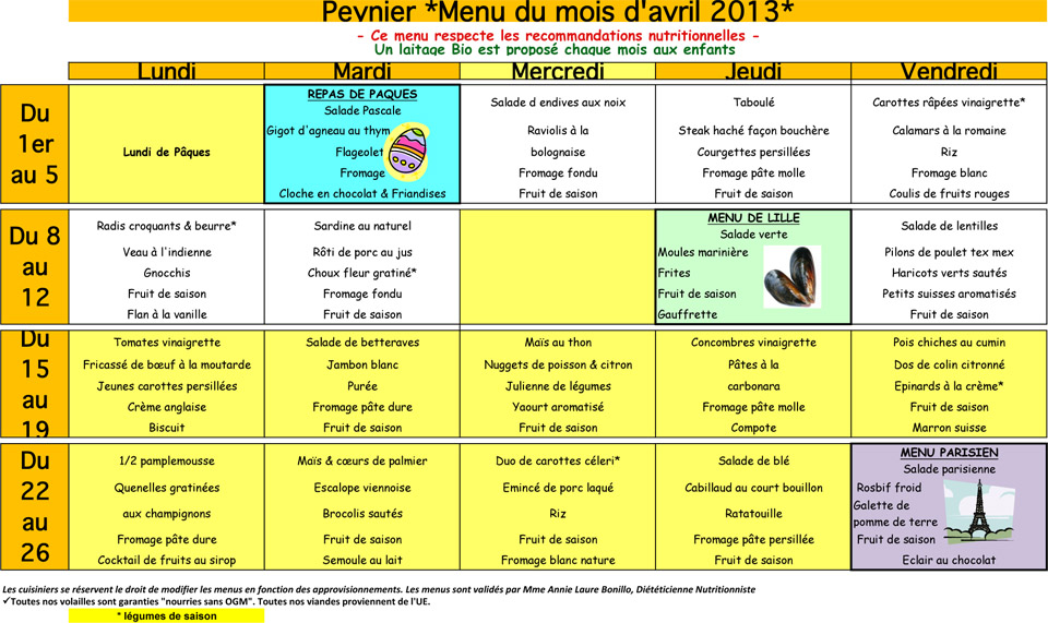 PEYNIER infosEcoles Menus restaurant scolaire Avril 2013 Par PEYNIER Communication - 31 mars 2013 Partagez FacebookTwitterWhatsAppEmailPrint Découvrez les menus du restaurant scolaire pour le mois d’avril 2013.