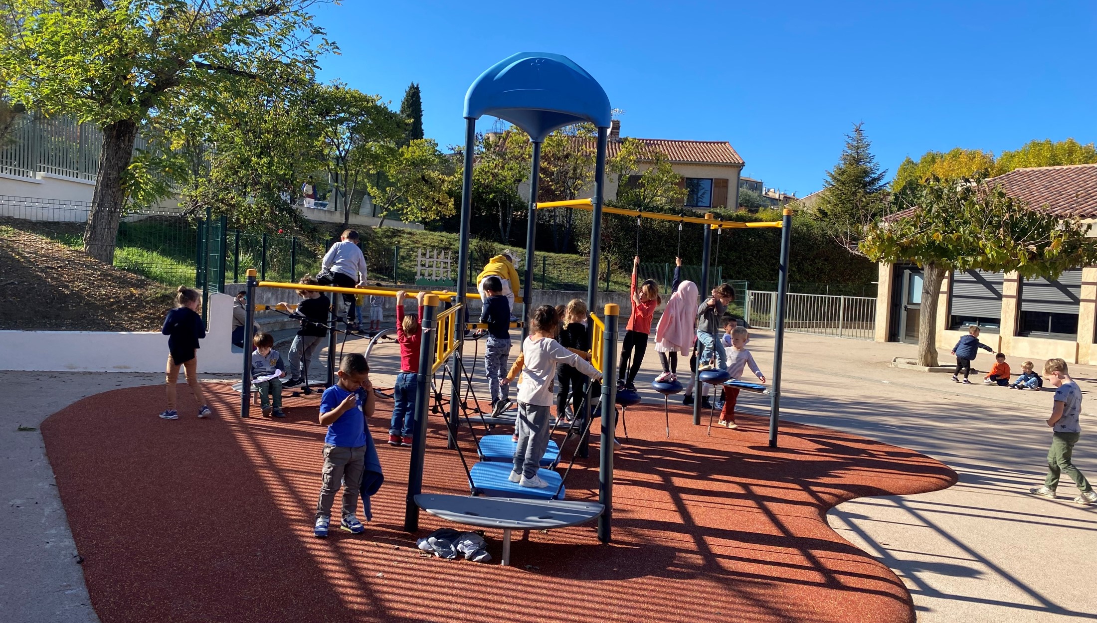 Comme prévu initialement, les vacances de la Toussaints ont permis de réaliser les enduits extérieurs côté cour, de poser la première structure de jeux avec sol souple ou encore de peindre les casquettes des murs de clôture.