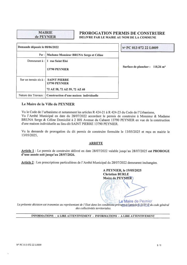 Prorogation de permis de construire délivré par le Maire au nom de la Commune.