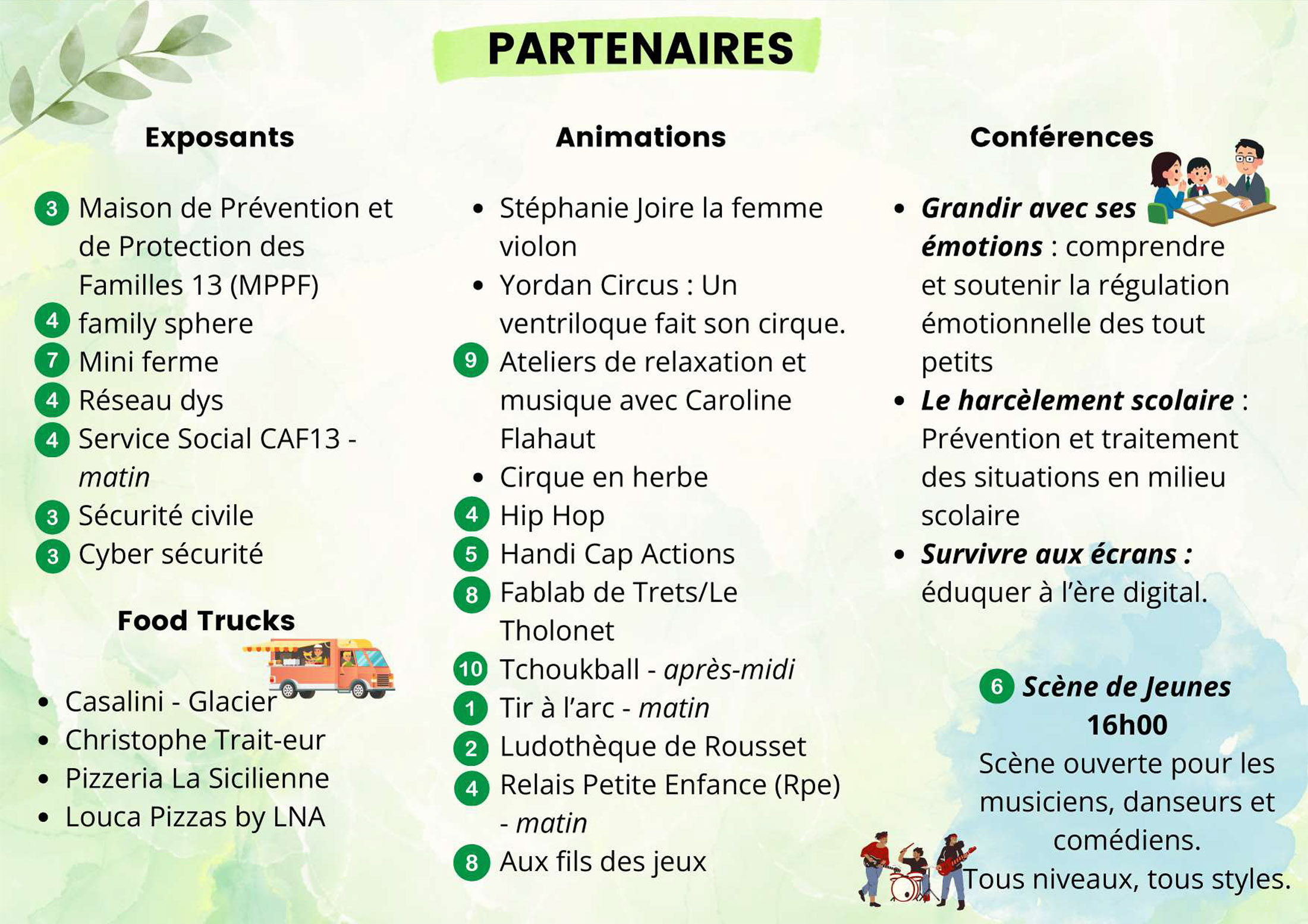 Pour clôturer cette belle journée, place à une scène ouverte dédiée aux jeunes artistes : musiciens, danseurs et comédiens, de tout âge et de tout niveau, seront invités à se produire. Un apéritif convivial viendra conclure cet événement.