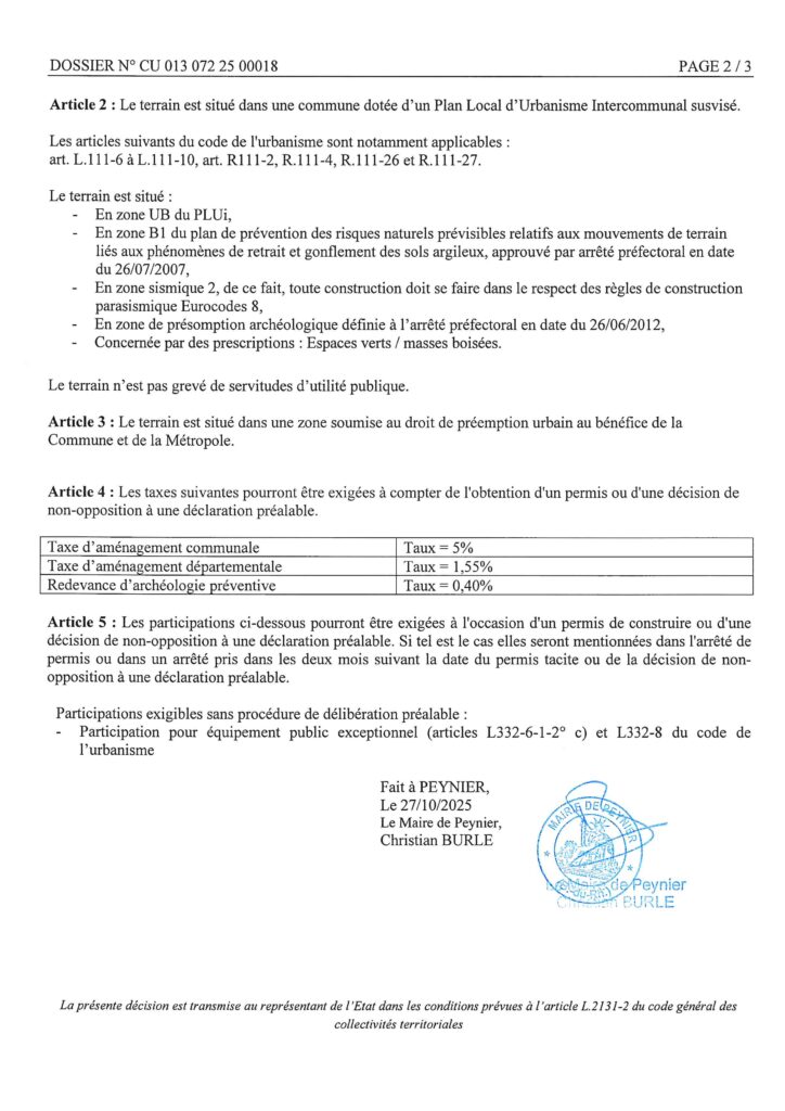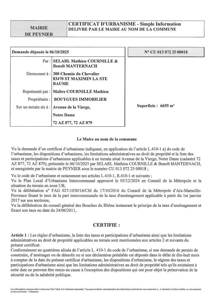 Affichage légal municipalUrbanisme Certificat d’urbanisme 013-072-25-00018 Par Mairie de Peynier - 27 octobre 2025 Partagez FacebookTwitterWhatsAppEmailPrint Certificat d’urbanisme – Simple information – délivré par le Maire au nom de la Commune.