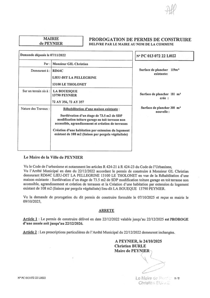 Prorogation de permis de construire délivré par le Maire au nom de la Commune.