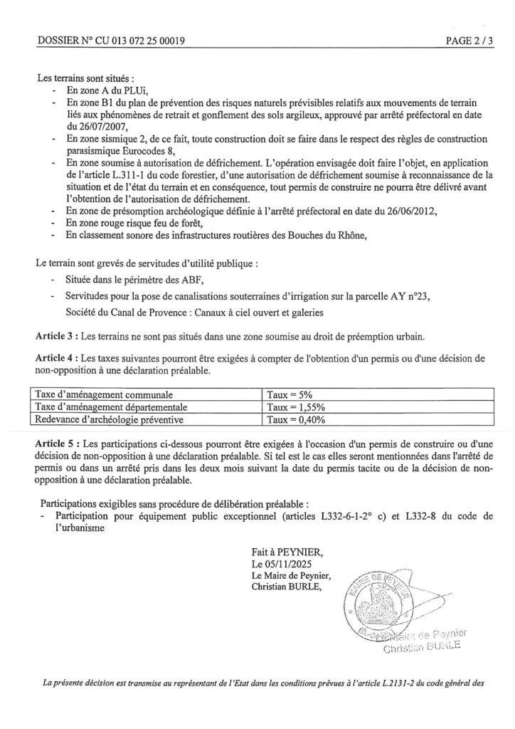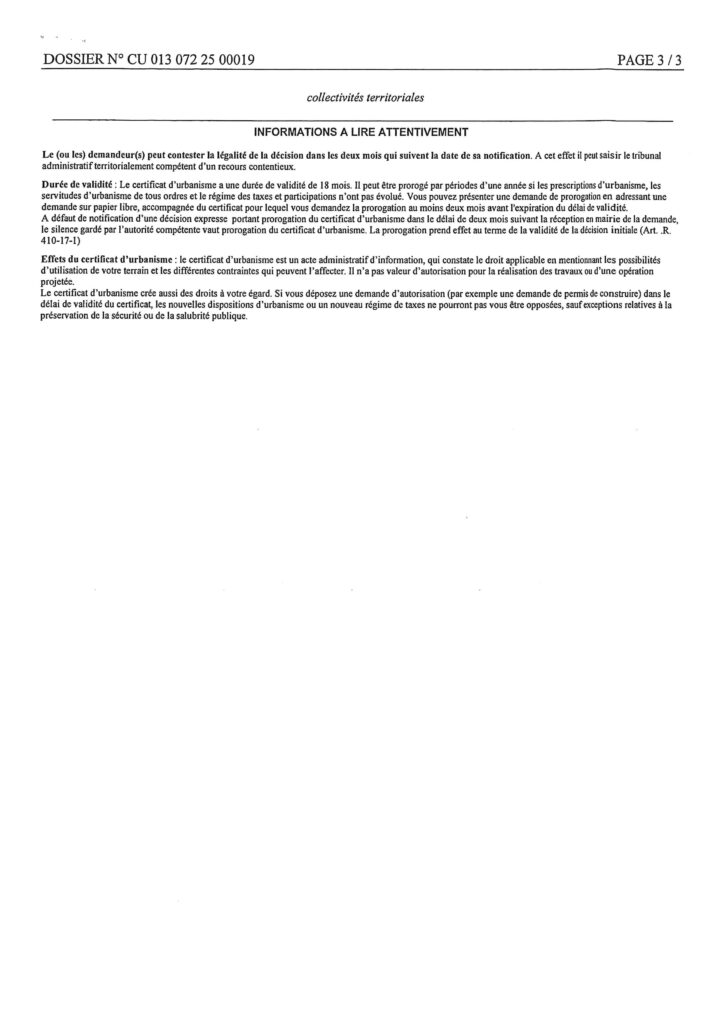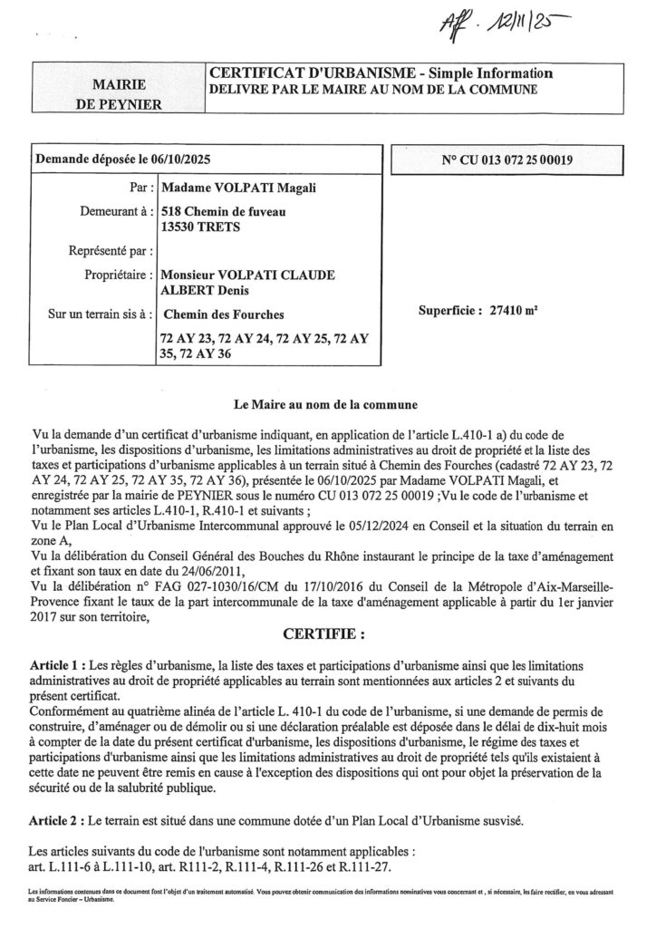 Certificat d’urbanisme – Simple information – délivré par le Maire au nom de la Commune.