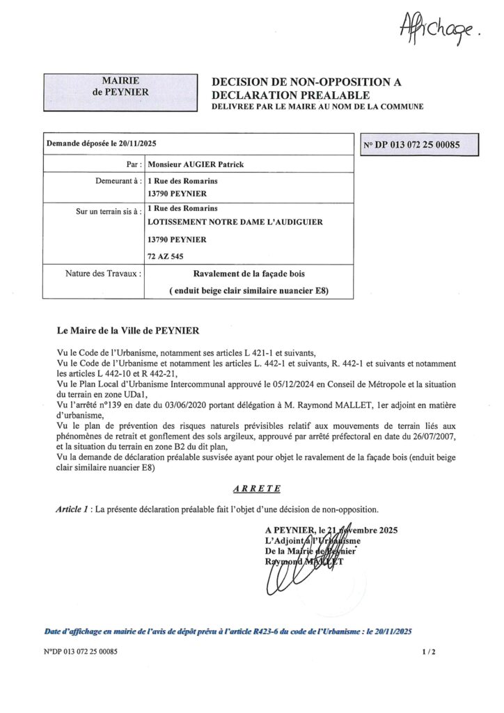 Affichage légal municipalUrbanisme Déclaration préalable de travaux 013-072-25-00085 Par Mairie de Peynier - 21 novembre 2025 Partagez FacebookTwitterWhatsAppEmailPrint Déclaration de non opposition à déclaration préalable délivrée par le Maire au nom de la Commune.