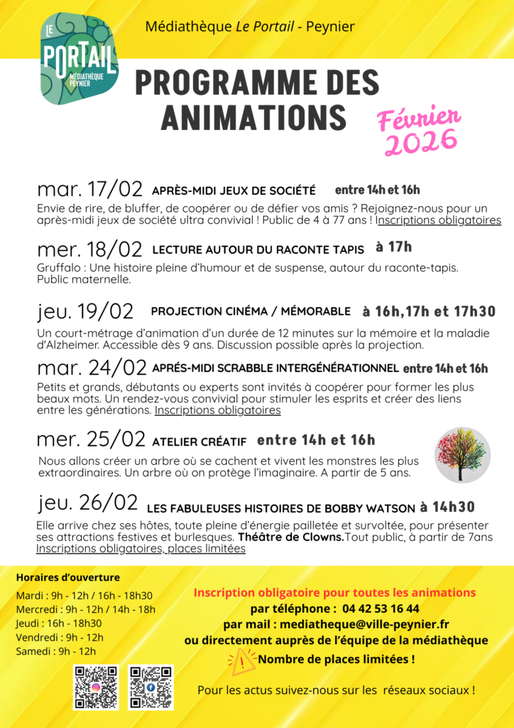 Les inscriptions peuvent se faire par téléphone au 04 42 53 16 44, par courriel à l’adresse mediatheque@ville-peynier.fr, ou directement auprès de l’équipe de la médiathèque.
