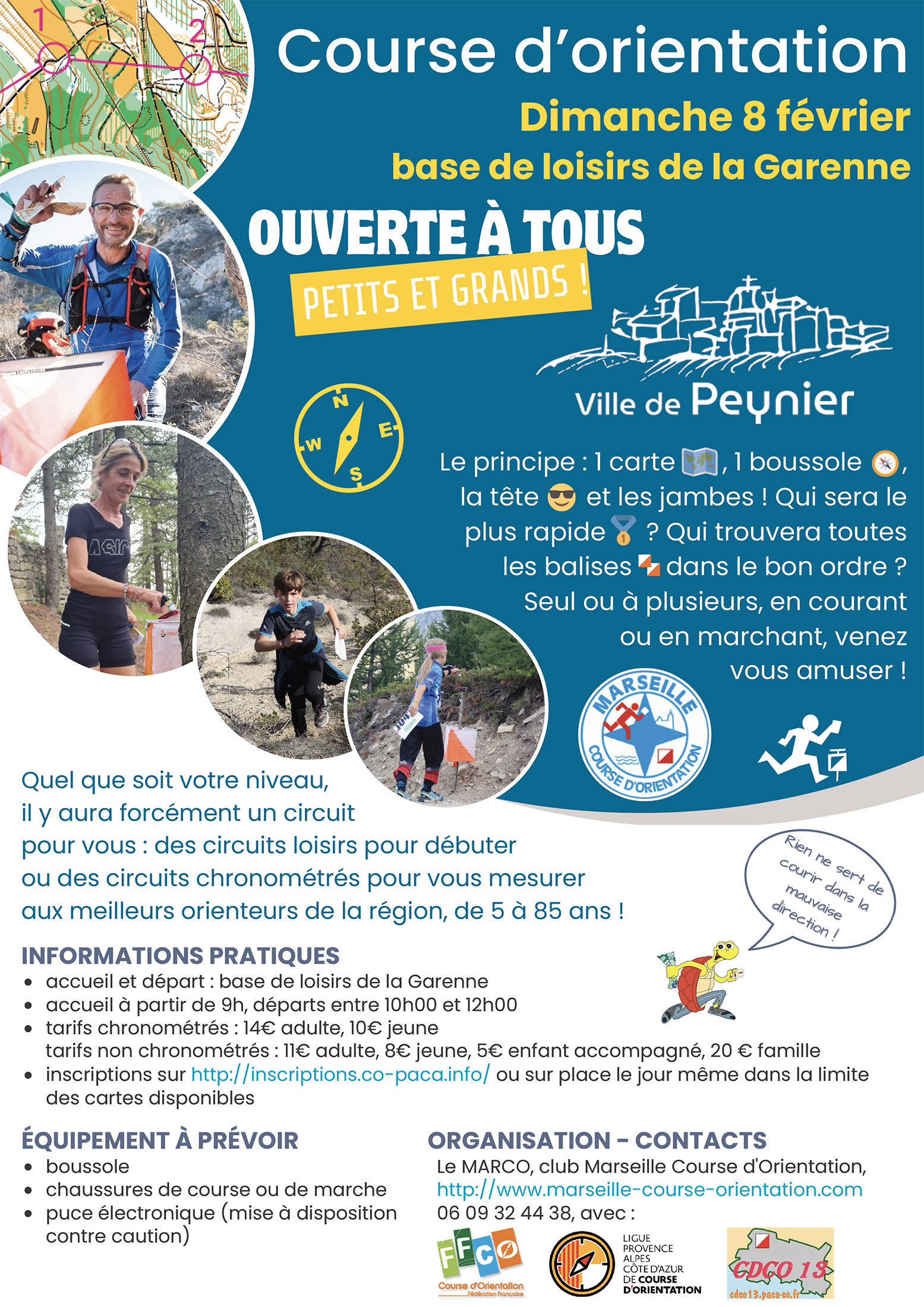 La Ville de Peynier, en partenariat avec le club de course d’orientation MARCO (Marseille Course d’Orientation), accueille une course d’orientation ouverte à tous le dimanche 8 février 2026, au départ de la Base de Loisirs de la Garenne.