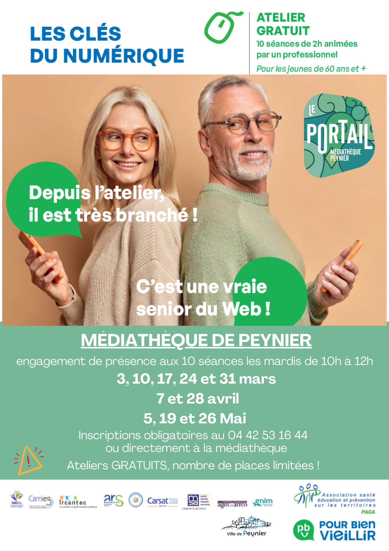 La médiathèque municipale, en partenariat avec l’Association de Santé, d’Éducation et de Prévention sur les Territoires (ASEPT) PACA, qui porte sur la région de la région Sud Provence-Alpes-Côte d’Azur les actions de prévention bénéfiques au « Bien Vieillir » conduites par les principales caisses de retraite des régimes de base et des complémentaires, propose une série d’ateliers numériques collectifs à destination des seniors de 60 ans et plus.