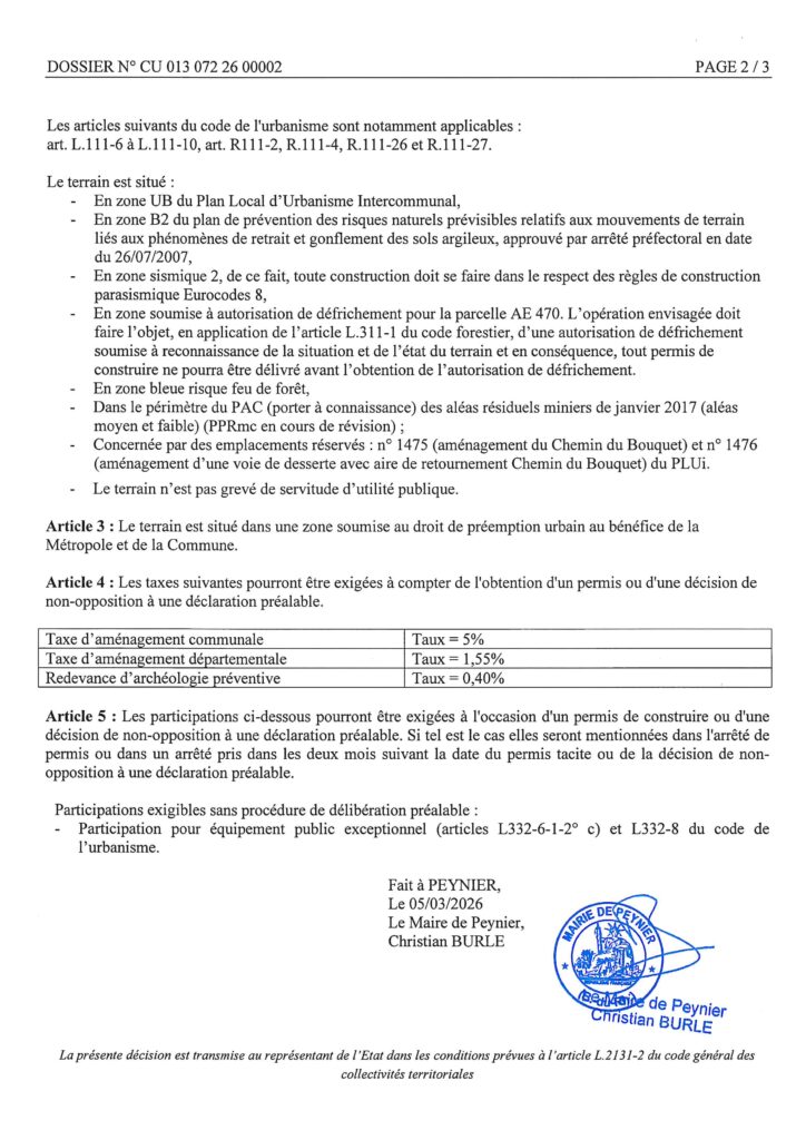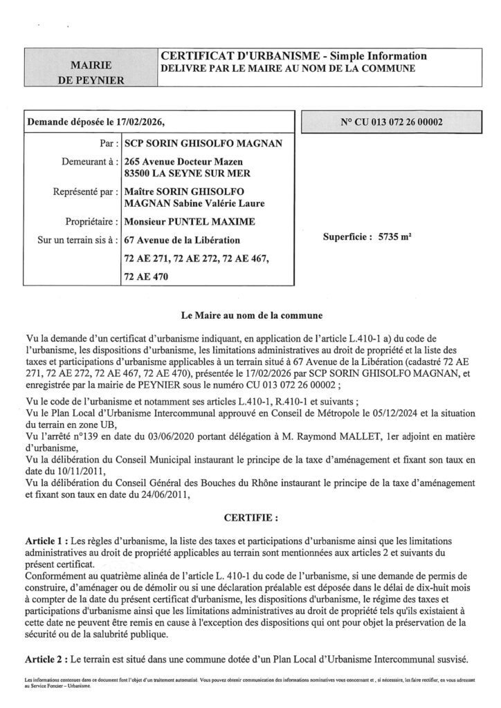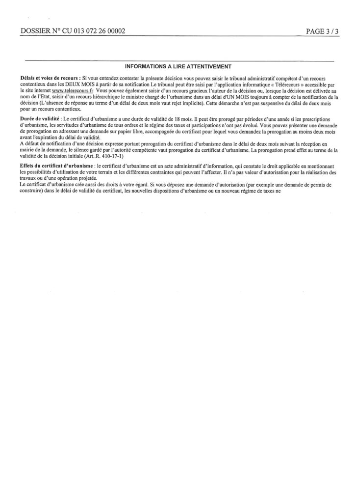 Certificat d’urbanisme – Simple information – délivré par le Maire au nom de la Commune.
