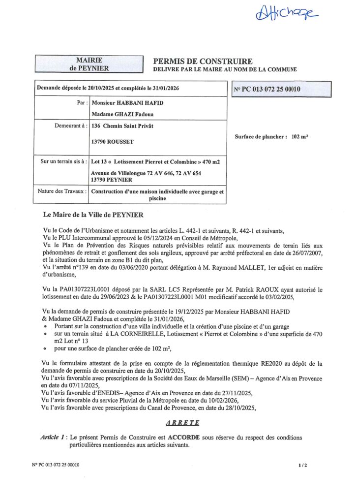 Affichage légal municipalUrbanisme Permis de construire 013-072-25-00010 Par Mairie de Peynier - 9 mars 2026 Partagez FacebookTwitterWhatsAppEmailPrint Permis de construire délivré par le Maire au nom de la Commune.