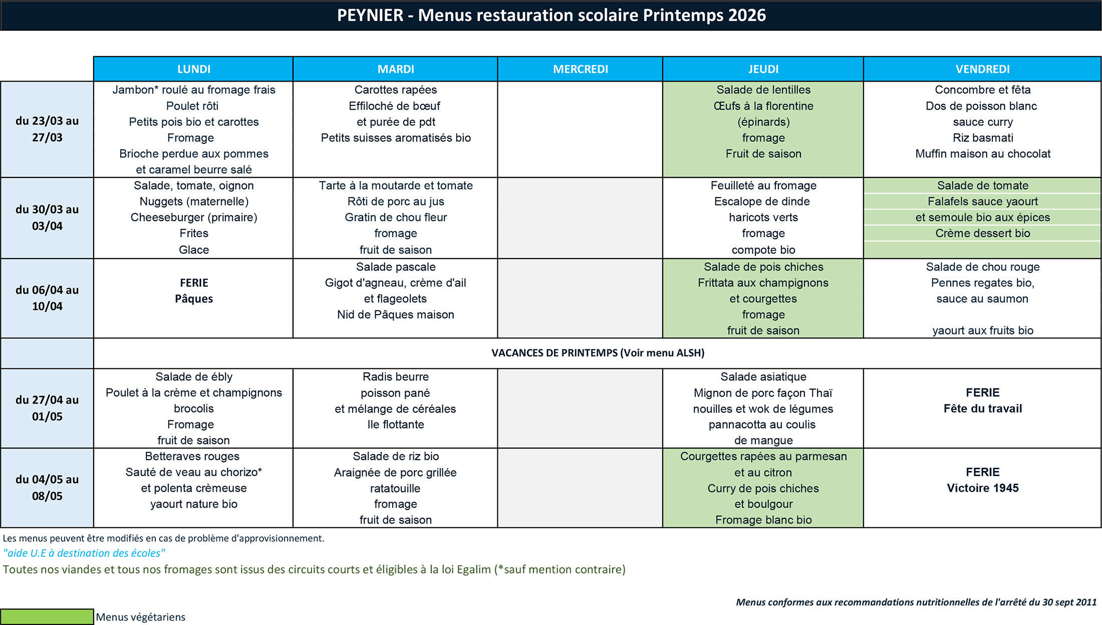 Découvrez les menus du restaurant scolaire, ALSH et des Aînés pour le mois d’avril 2026.
