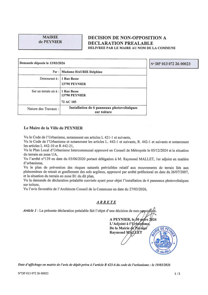 Affichage légal municipalUrbanisme Déclaration préalable de travaux 013-072-26-00023 Par Mairie de Peynier - 8 avril 2026 Partagez FacebookTwitterWhatsAppEmailPrint Décision de non opposition à déclaration préalable délivrée par le Maire au nom de la Commune.