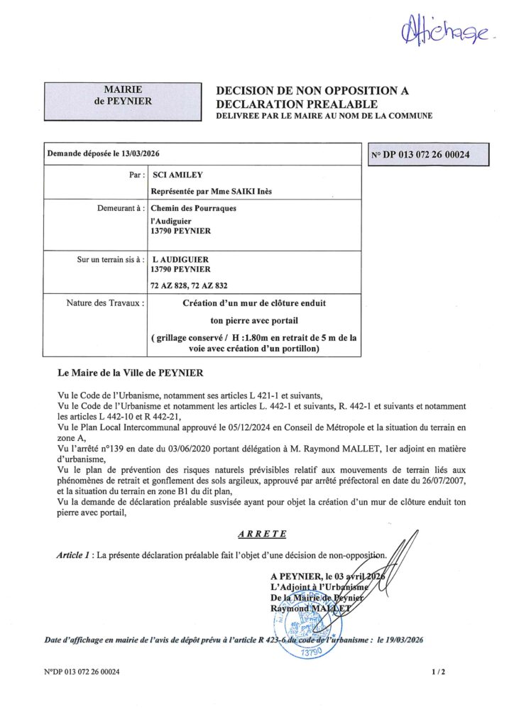 Affichage légal municipalUrbanisme Déclaration préalable de travaux 013-072-26-00024 Par Mairie de Peynier - 8 avril 2026 Partagez FacebookTwitterWhatsAppEmailPrint Décision de non opposition à déclaration préalable délivrée par le Maire au nom de la Commune.