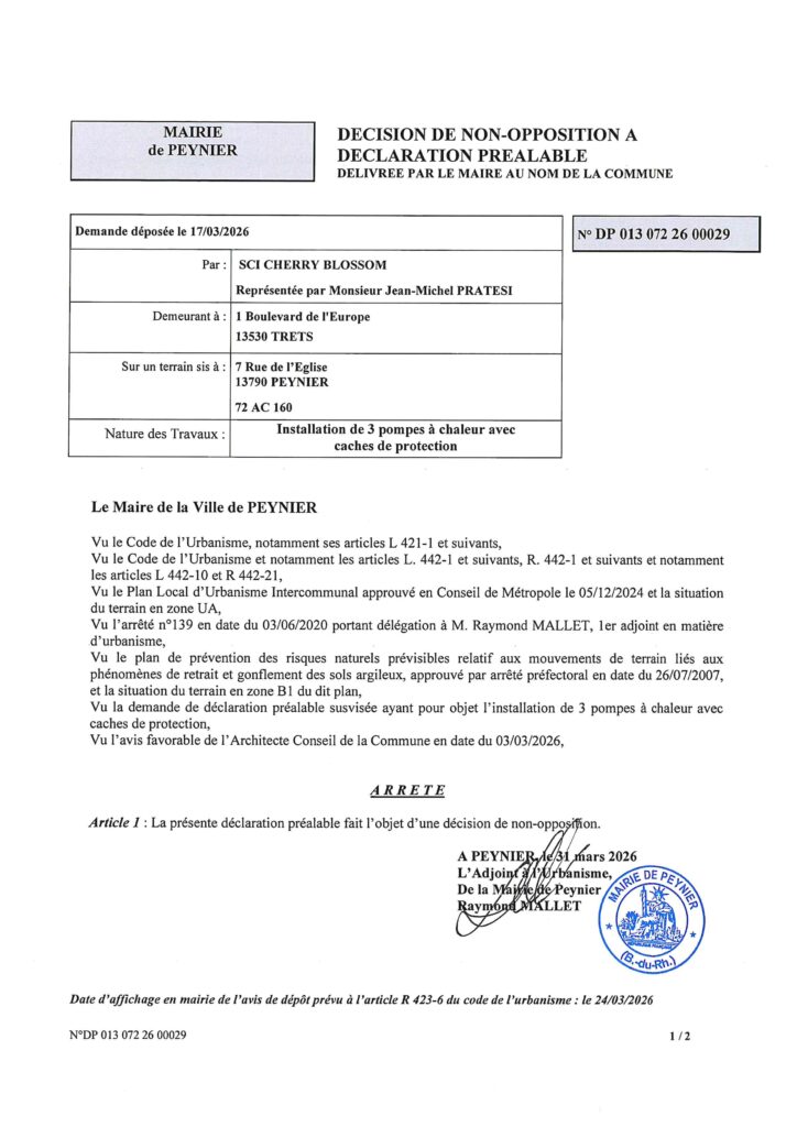 Affichage légal municipalUrbanisme Déclaration préalable de travaux 013-072-26-00029 Par Mairie de Peynier - 8 avril 2026 Partagez FacebookTwitterWhatsAppEmailPrint Décision de non opposition à déclaration préalable délivrée par le Maire au nom de la Commune.
