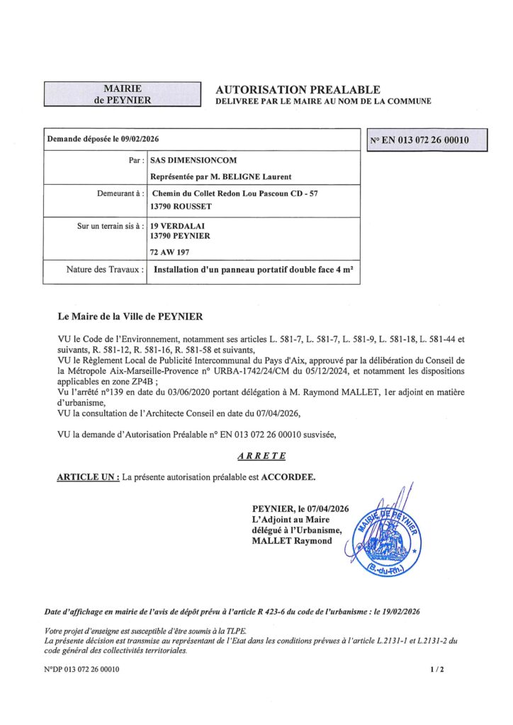 Déclaration de non opposition à déclaration préalable délivrée par le Maire au nom de la Commune.