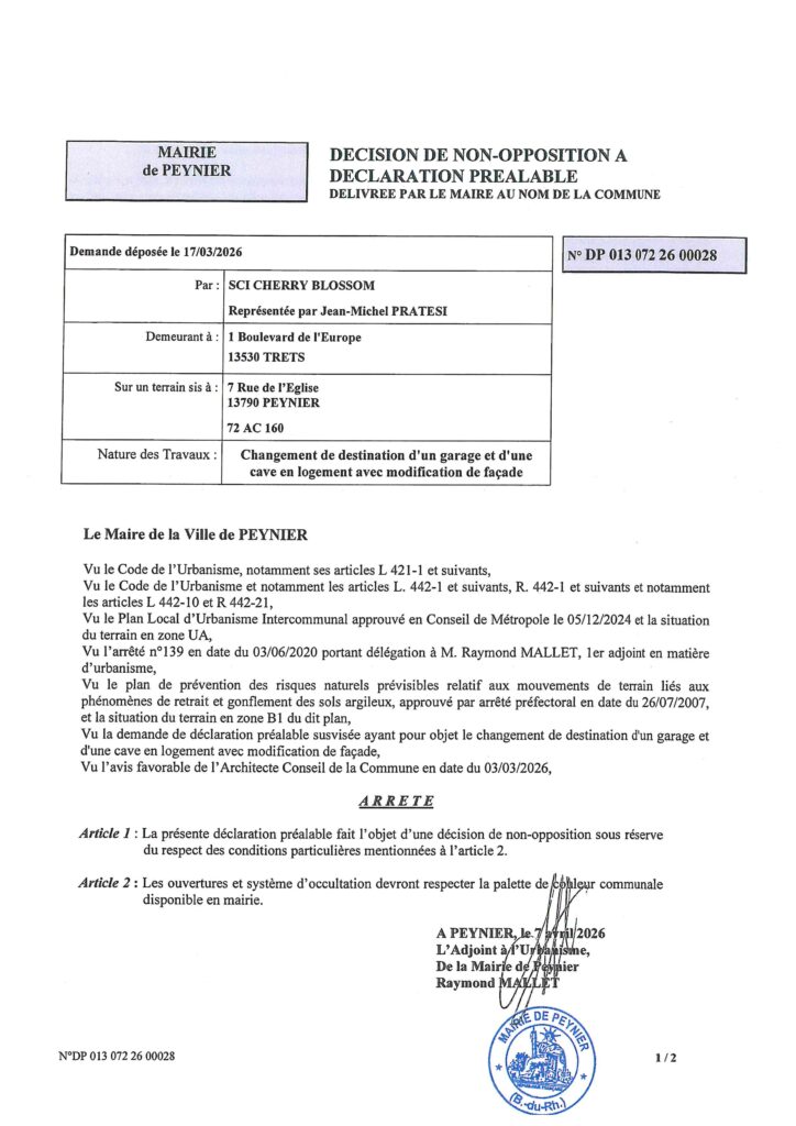 Affichage légal municipalUrbanisme Déclaration préalable de travaux 013-072-26-00028 Par Mairie de Peynier - 15 avril 2026 Partagez FacebookTwitterWhatsAppEmailPrint Décision de non opposition à déclaration préalable délivrée par le Maire au nom de la Commune.